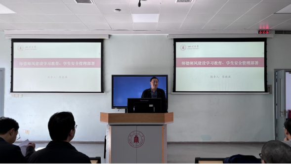 张晓满副书记开展了作师德师风建设学习教育。他结合典型案例给全院教职工做师德师风警示教育,并指出,要以案为鉴,深刻反思深刻汲取案例教训,增强责任感和使命,认真进行自我审视,警钟长鸣,严以律己。会上,张晓满副书记就学生安全管理工作进行安排部署,要求导师进一步做好学生稳定安全的风险防控和隐患排查,了解学生思想动态、全面提升学生安全稳定工作的针对性和实效性。